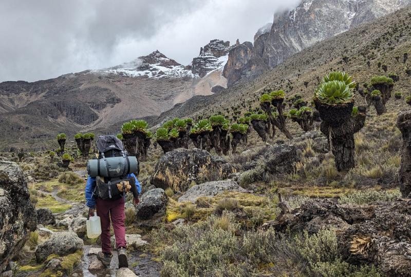 The landscape transitions to heath & moorland, featuring waist-high tussock grasses, mountain sedges and hardy plants adapted to the challenging rocky environment. This zone is known for its unique and colorful plant life which additionally includes giant heathers, “giant rosette plants”, mountain proteas, and several species of lobelia.